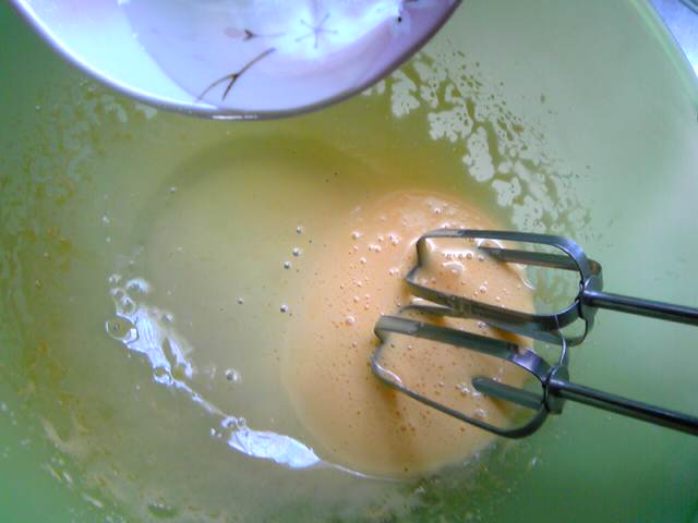 2.卵白をよくあわ立て、果糖を2、3回に分けて加えしっかりしたメレンゲを作る。